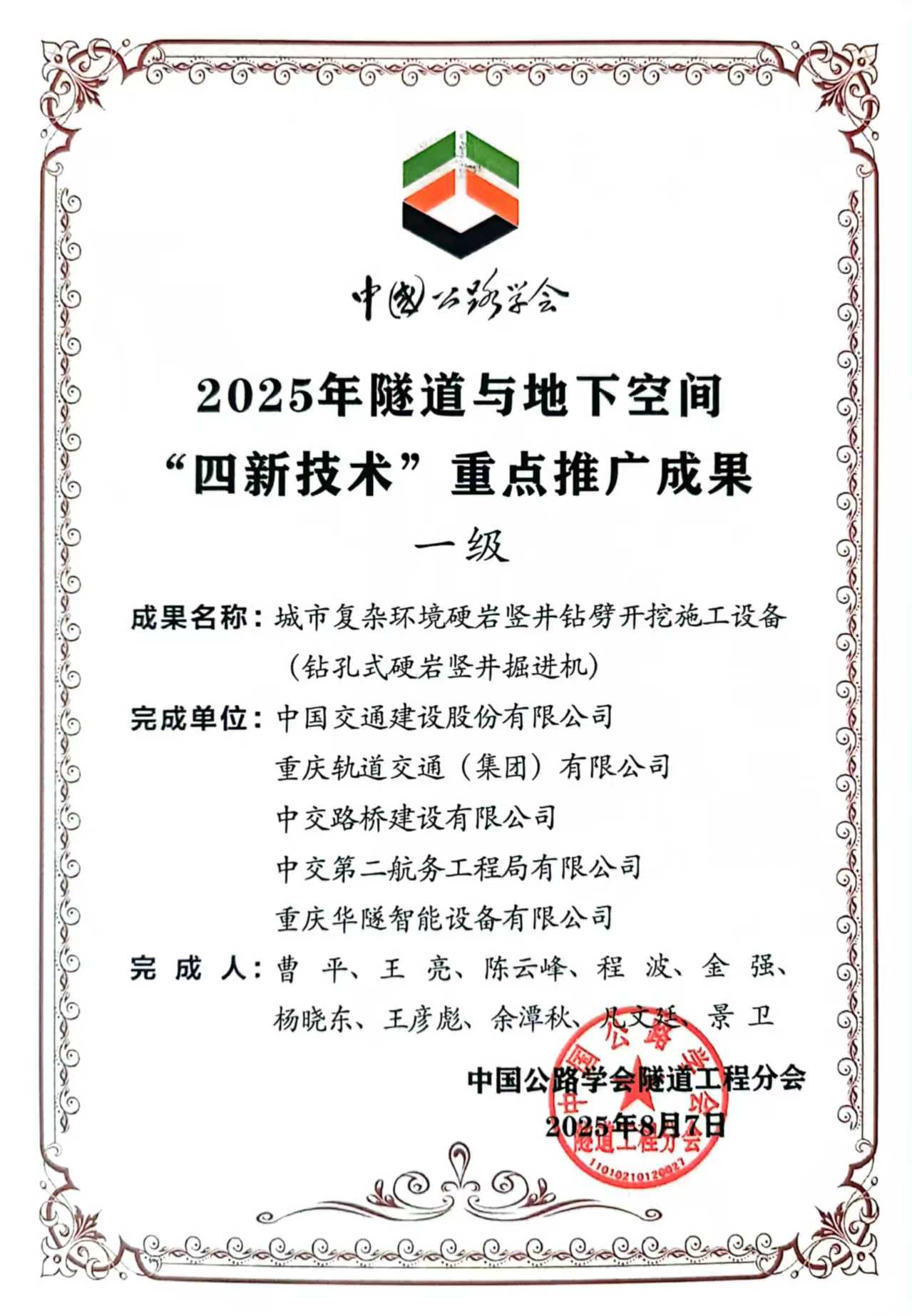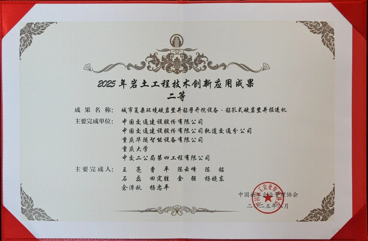 近日,由项目科研团队参与研发的“城市复杂环境硬岩竖井钻劈开挖施工设备(钻孔式硬岩竖井掘进机)”,荣获“2025年隧道与地下空间‘四新技术’重点推广一级成果”及“2025年岩土工程技术创新应用成果二等”两项行业重要奖项,标志着该设备在硬岩竖井非爆开挖技术领域获得权威认可。